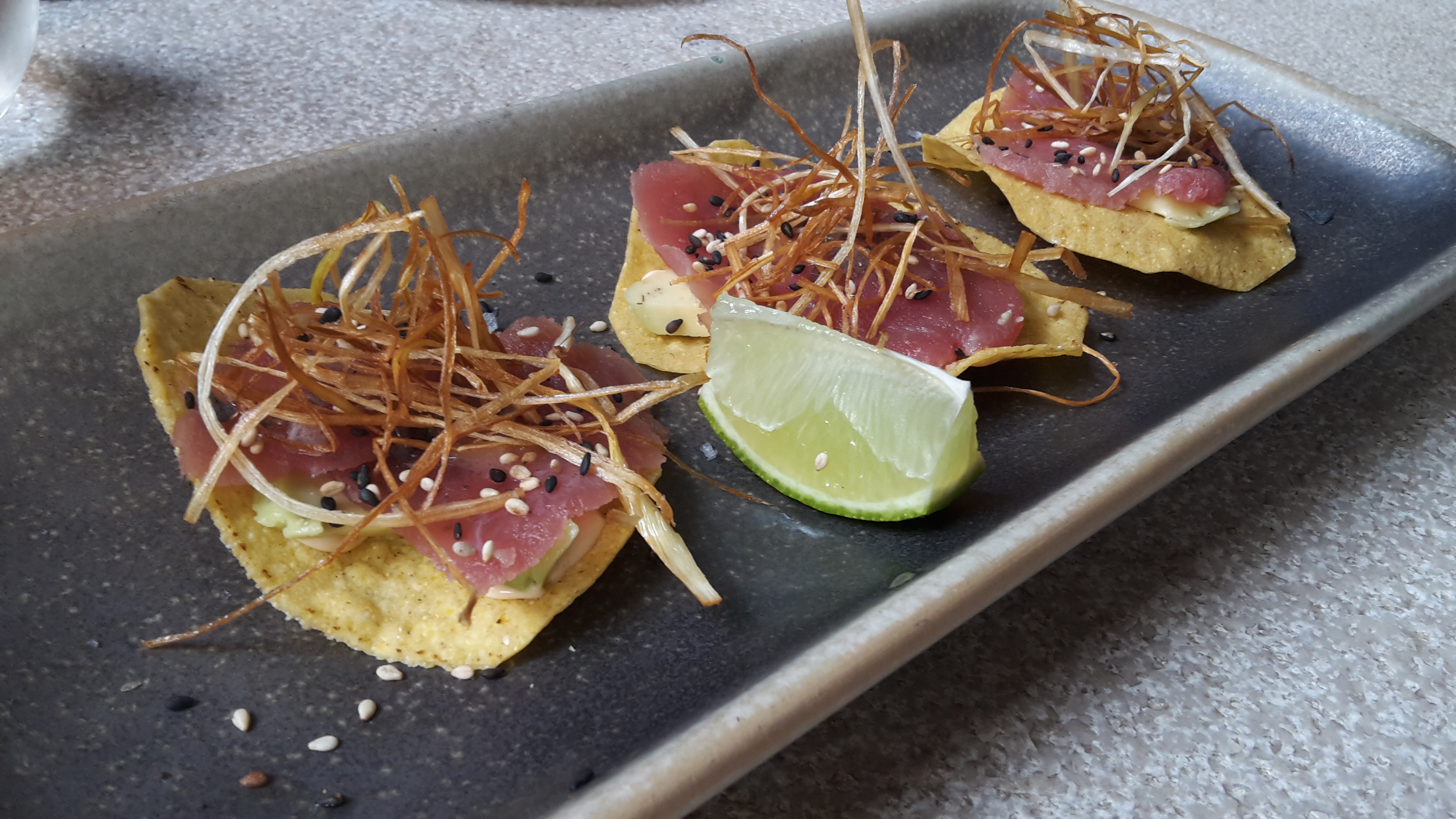 Tortita with tuna sashimi, avocado and chipotle mayo