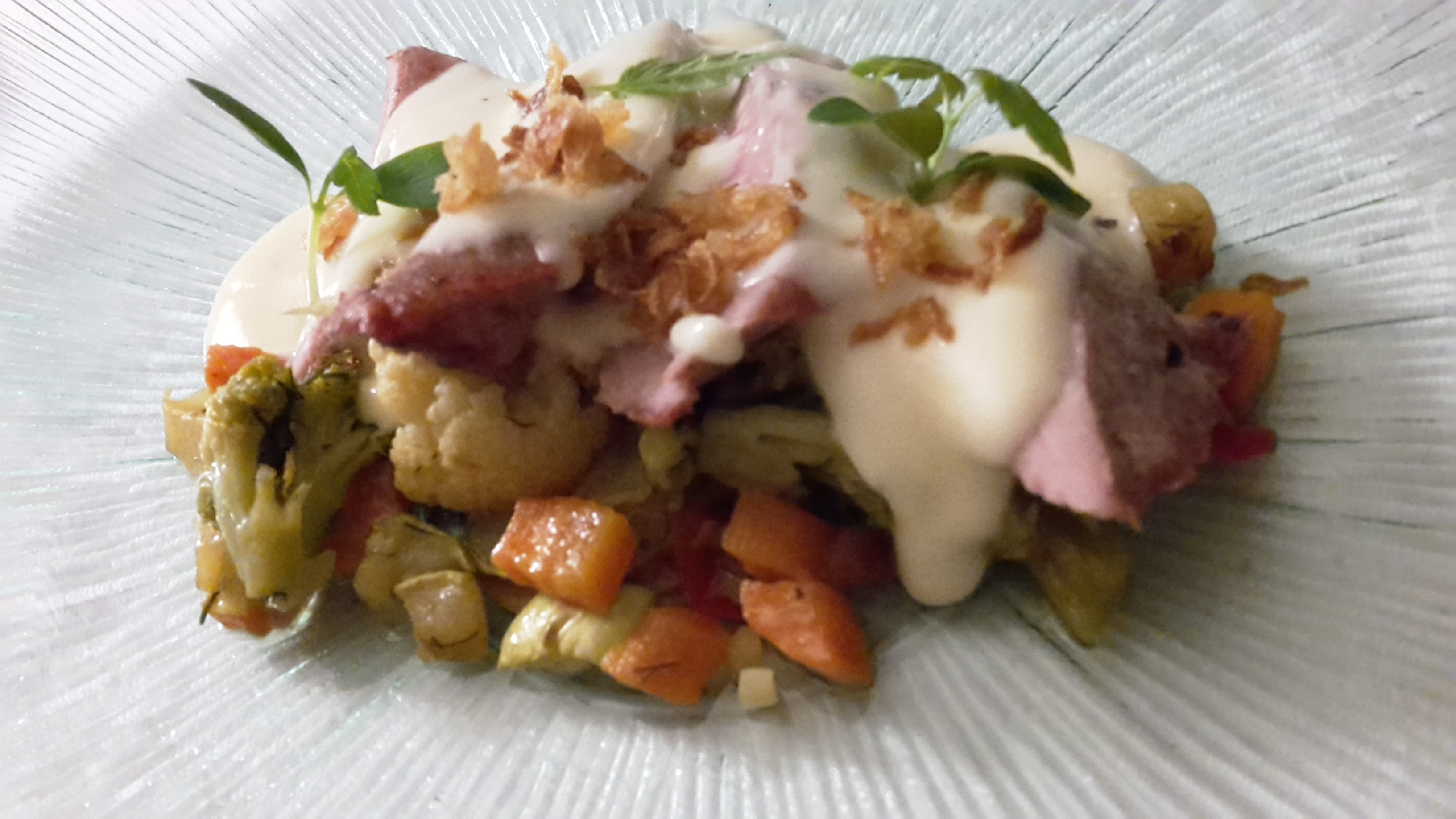 20171027_201849 October 31, 2017 3264 × 1836 ‘Presa’ of black pork with Binigarba (Menorcan) cheese sauce and sauteed vegetables. Excellent.
