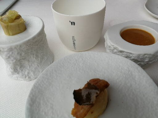Snacks at Cova Negra August 6, 2019 512 × 384 A trio of snacks – including a rich tasty lobster broth (right) started our tasting-menu dinner.