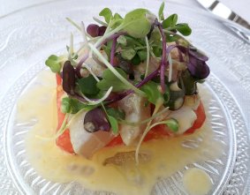 Fresh-tasting pink-tomato tartar with marinated bonito