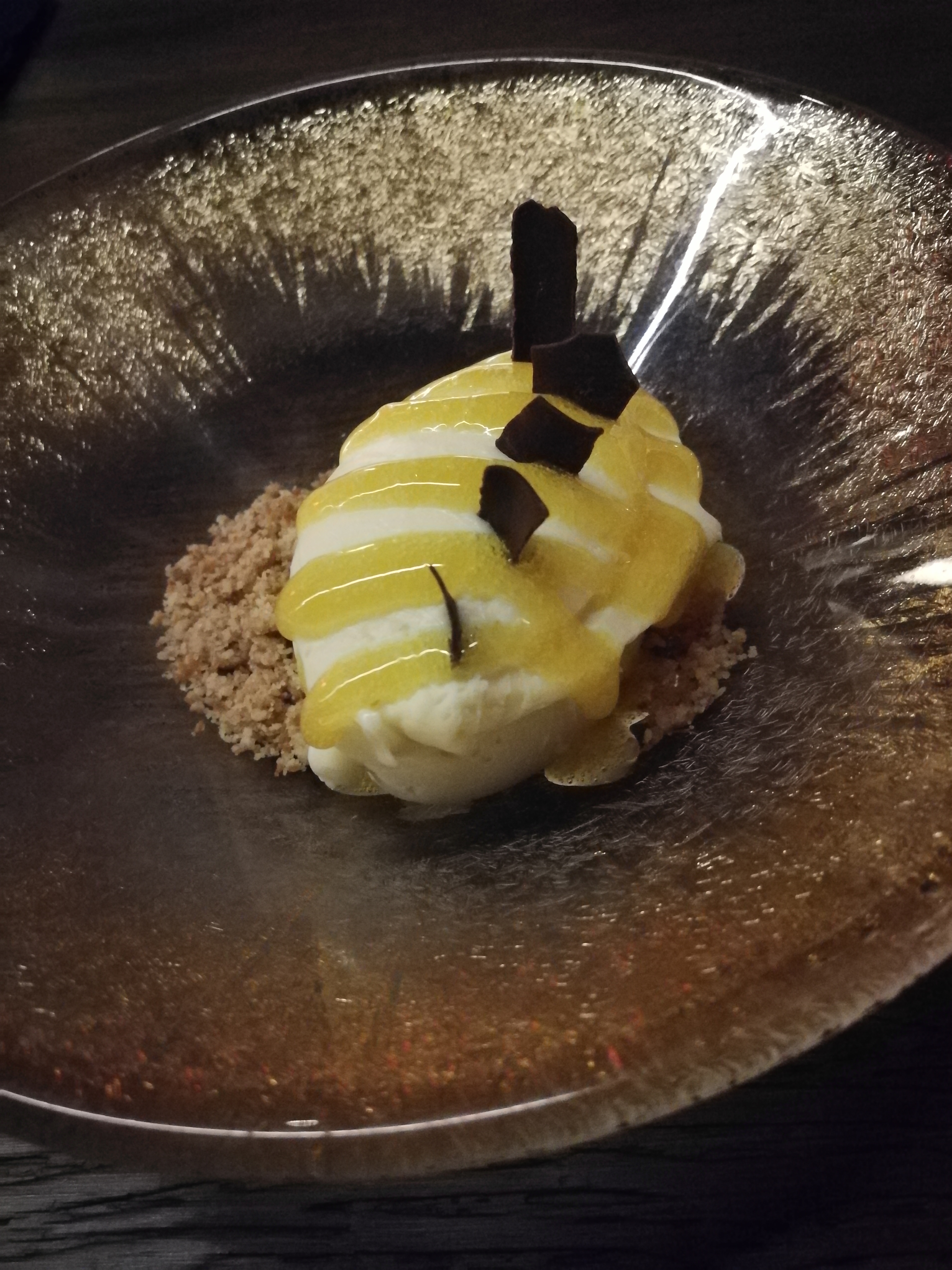mde February 13, 2020 3840 × 5120 White chocolate and yuzu ganache with coconut crumble and passion fruit