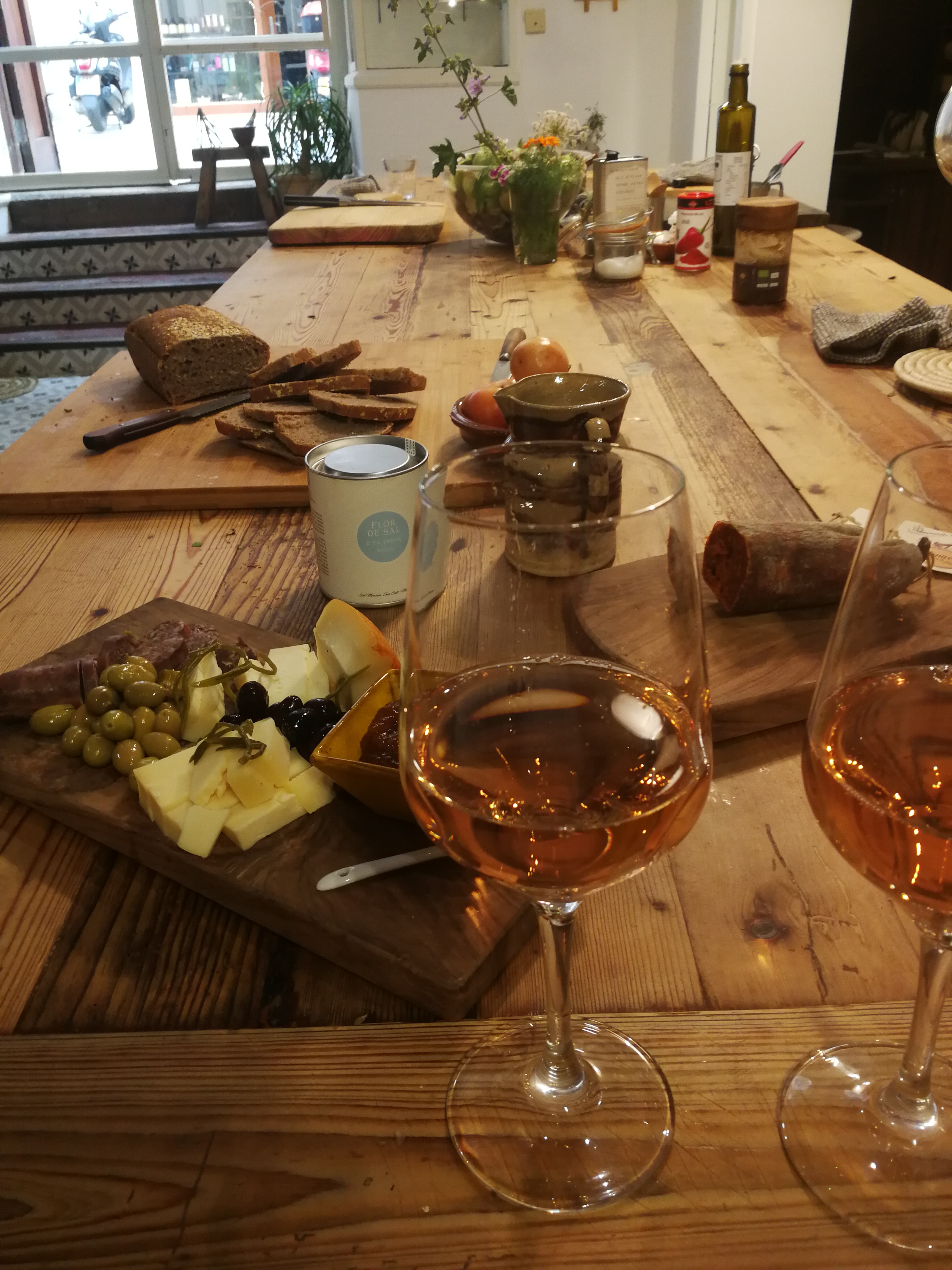 Once the coca was in the oven baking, it was time for our aperitif. Deborah had laid out the Mallorcan bread, ramallet tomatoes (to rub on the bread) extra virgin olive oil, green and black olives, pickled sea fennel, botifarro, Menorca cheeses, and an organic sobrasada (from Son Cànaves of Llucmajor). The latter was a delicious revelation and I shall be seeking out this product for use in my own kitchen. Deborah poured us each a glass of Ribas Rosado, made from the Mantonegro grape, which paired beautifully with the sobrasada.