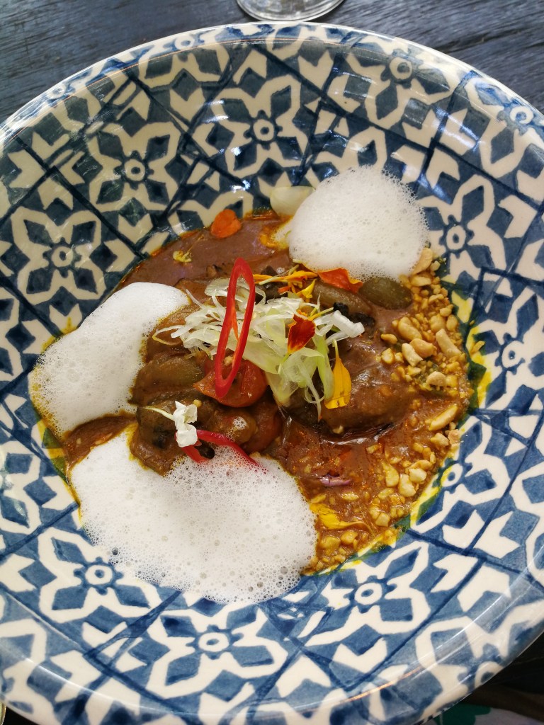Next, the yellow Thai curry with line-caught hake, shiitakes, shallots, snow peas, confit tomato, and peanuts. It comes with a side of rice and is 28,90€. The generous piece of hake was perfectly cooked; I am salivating as I recall eating this deliciously spicy dish.