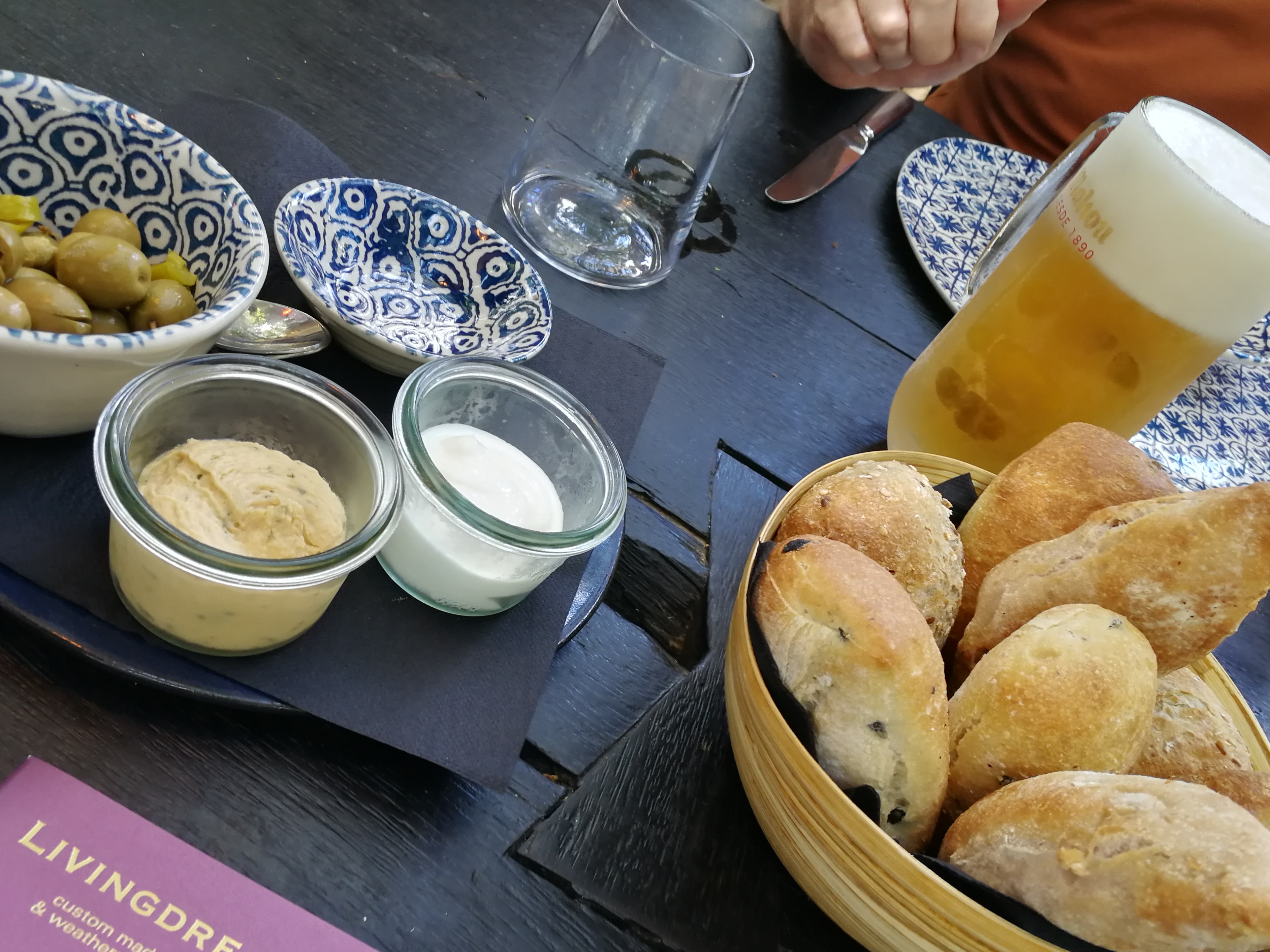 The assorted bread rolls with olives and alioli come with the welcome addition of curry and coconut hummus – delicious. You pay 4,80€ for this, but the bread’s very good and that hummus is so moreish.