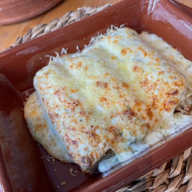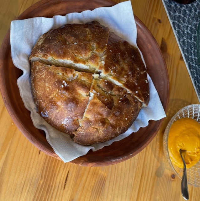 Bartomeu offers a set lunch menu on Wednesdays, Thursdays, and Fridays. The menu changes every week and is published in advance on social media. Lunch begins with a round loaf of Tomeu’s moreish olive oil bread and a spicy mayo to spread on it. If we lived closer to Sa Coma, this bread would be my dietary downfall; it’s so moreish.