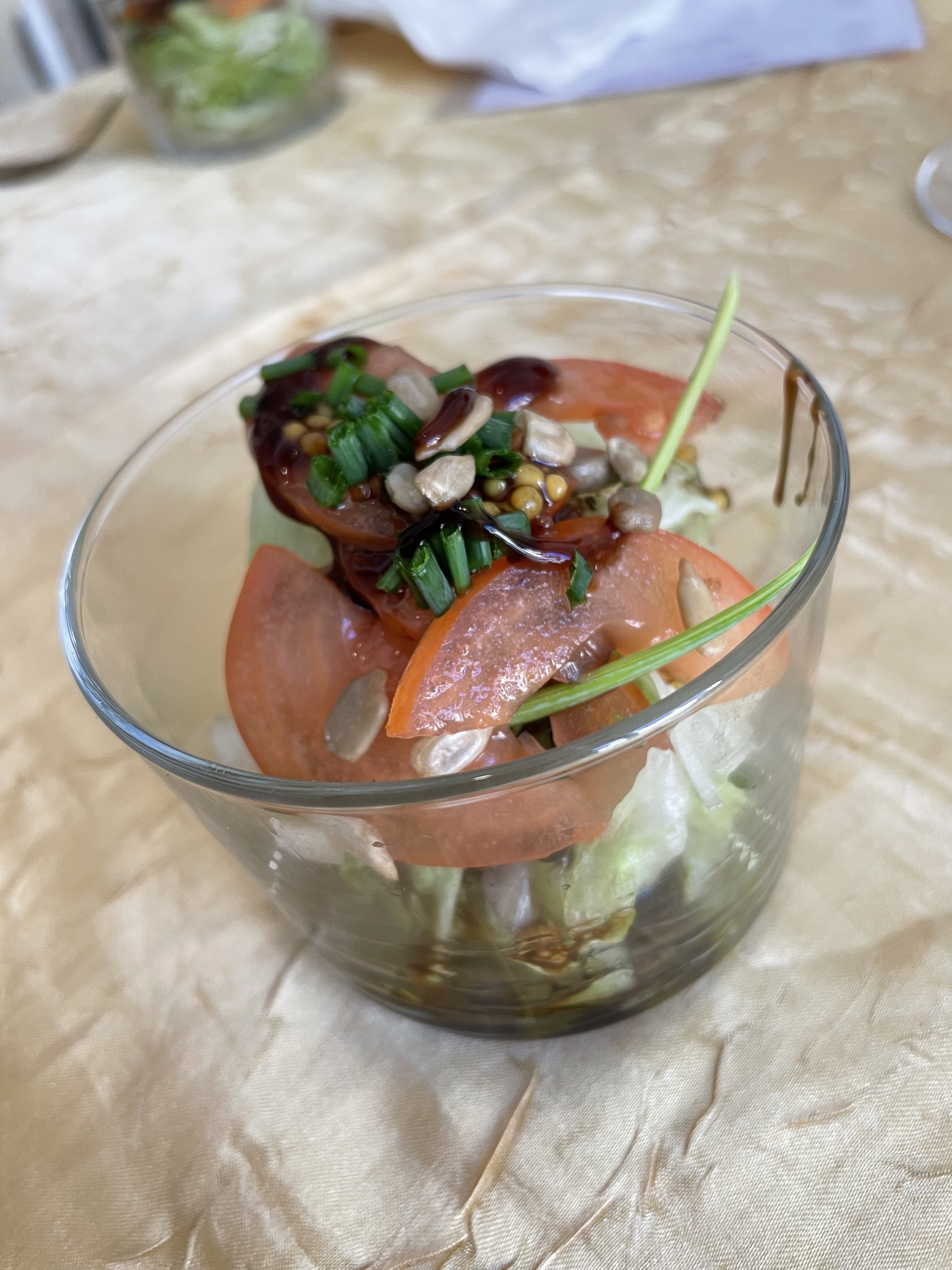 We were there for the three-course lunch, which was not only delicious but also good value. It began with a cup of delicious courgette soup, with a hint of coconut (not pictured).