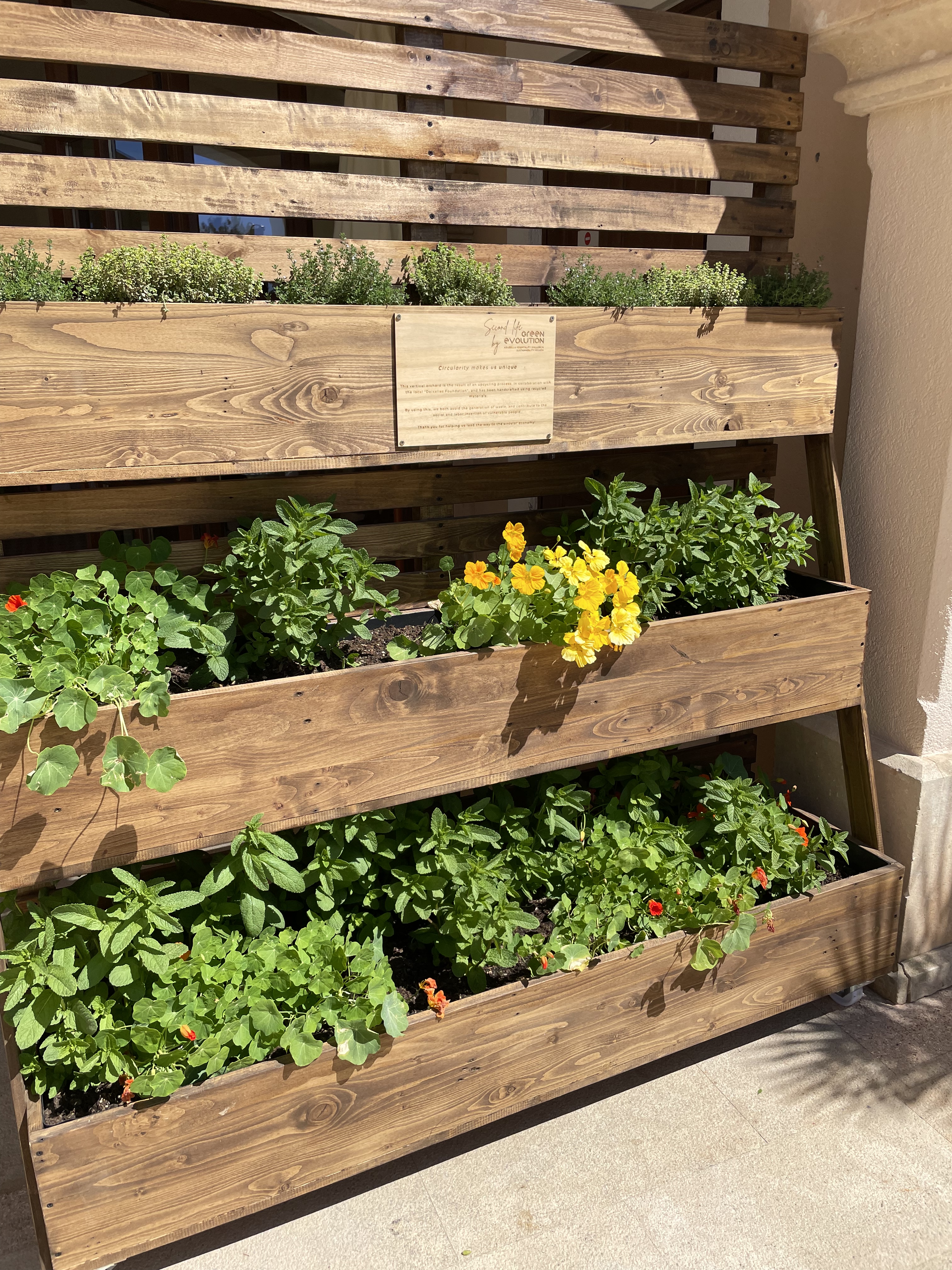 Farm-to-table food is increasingly available in Mallorca, where restaurant chefs who have the space to do so, grow at least some of the fresh produce they use – or obtain it from a trusted local farmer or smallholder. It’s a good sign when you see a raised bed bursting with greens or herbs just a short walk from the restaurant kitchen door. So the sight of the vertical orchards, crammed with herbs and edible flowers, made me smile as I went into the new Terra restaurant for a media lunch.
