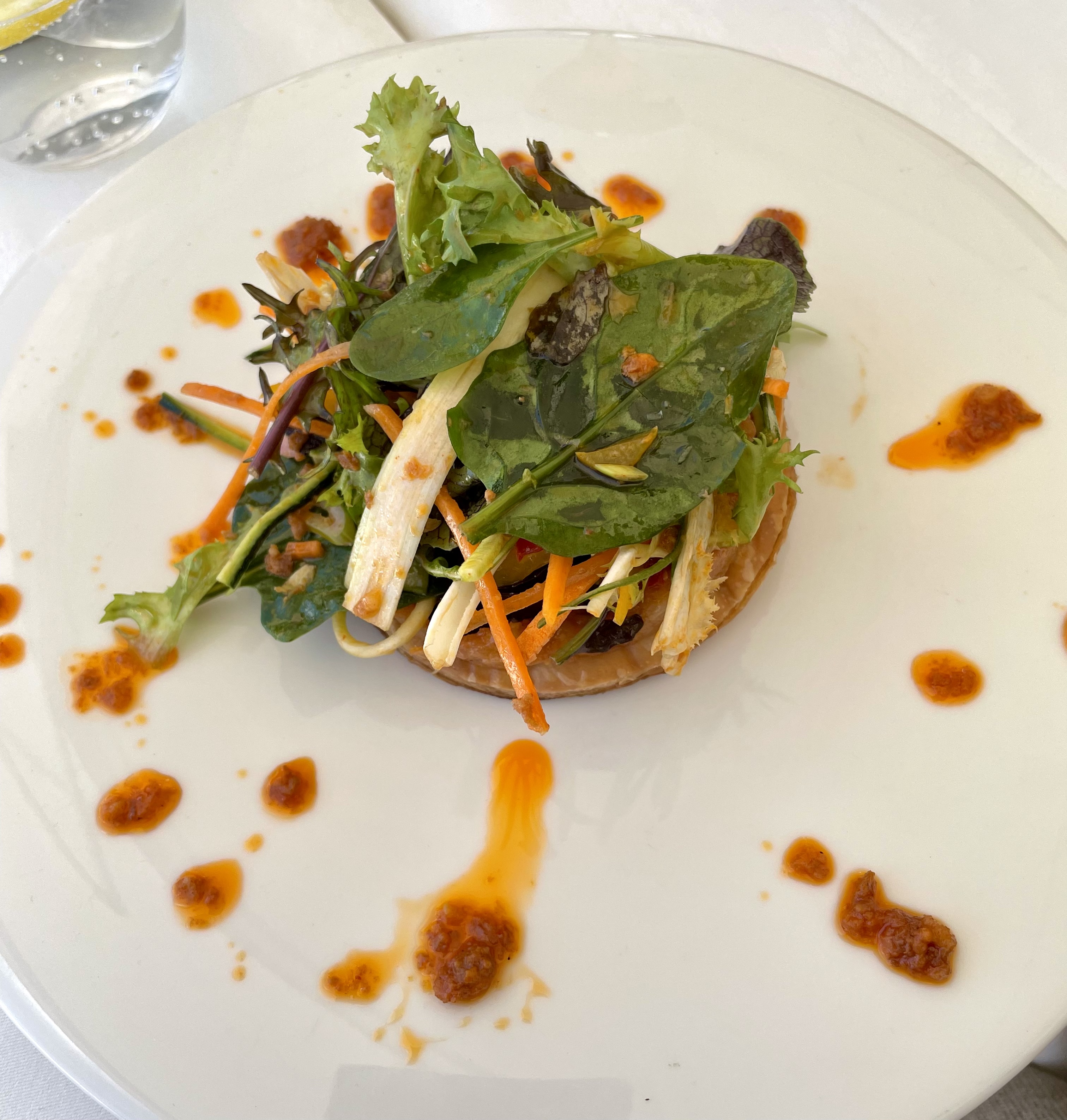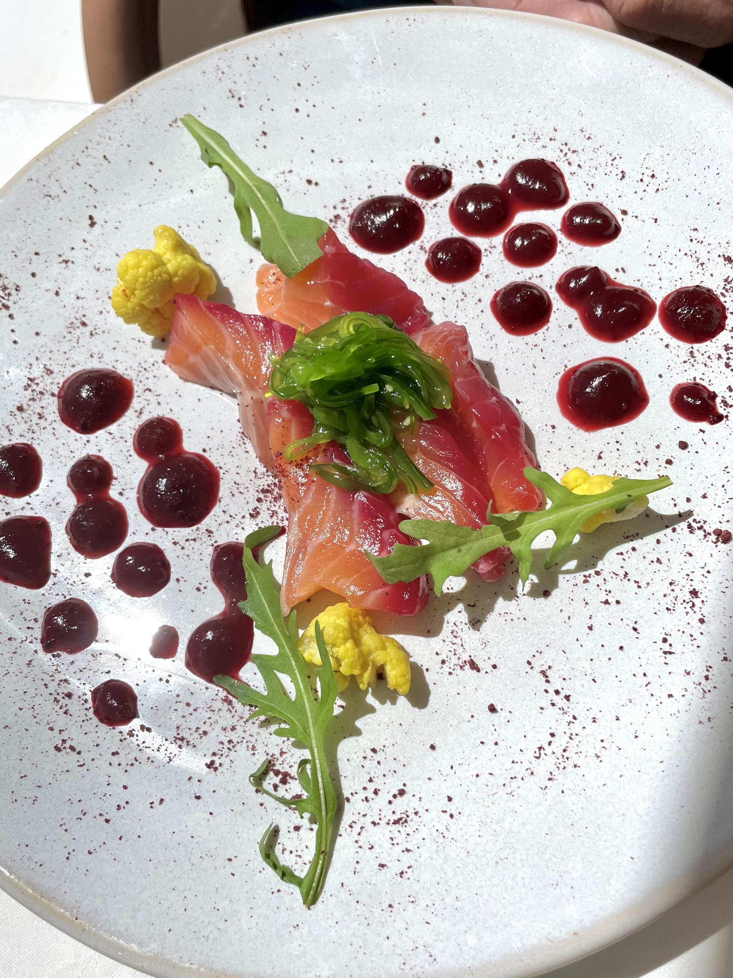 We went on a Sunday and were able to park easily on the street a short walk from the restaurant – although that may not be the case in high season. Once seated on the terrace, we studied the Bistro Menu, with its choice of three starters, three mains, and two desserts. Lunch included a promising start of warm bread roll, alioli, tapenade, and olives. I chose a crisp pastry tart of seasonal vegetables with warm sobrasada vinaigrette and salad; my husband had the marinated salmon with cauliflower pickles and beetroot ketchup.