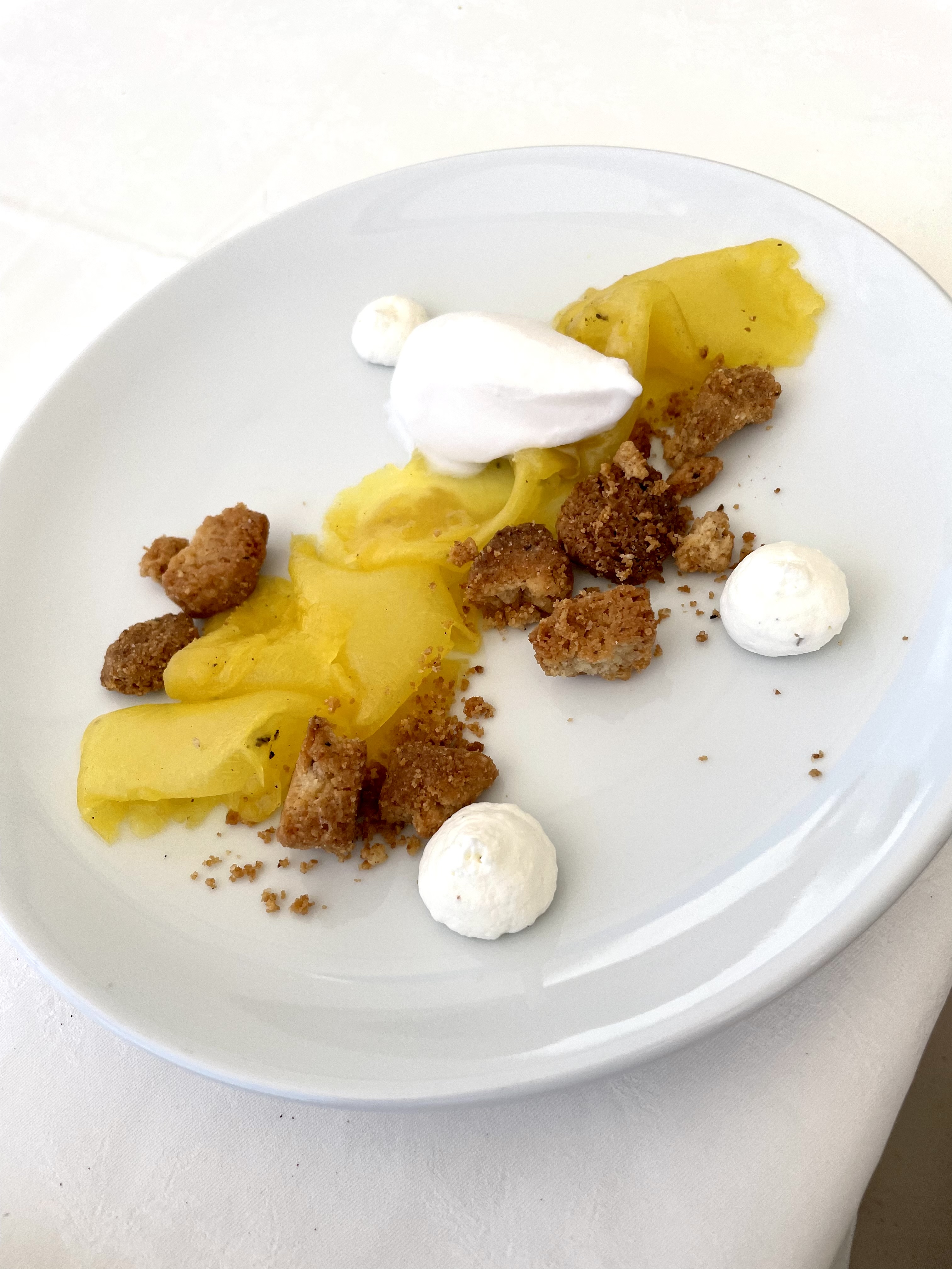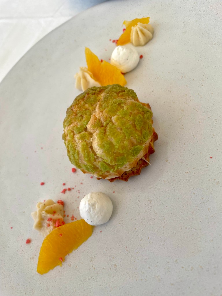 Desserts were a refreshing pineapple carpaccio roasted with black pepper and served with coconut sorbet, and a more calorific French petit choux craquelin (a type of brioche) with pistachio cream and orange compôte.