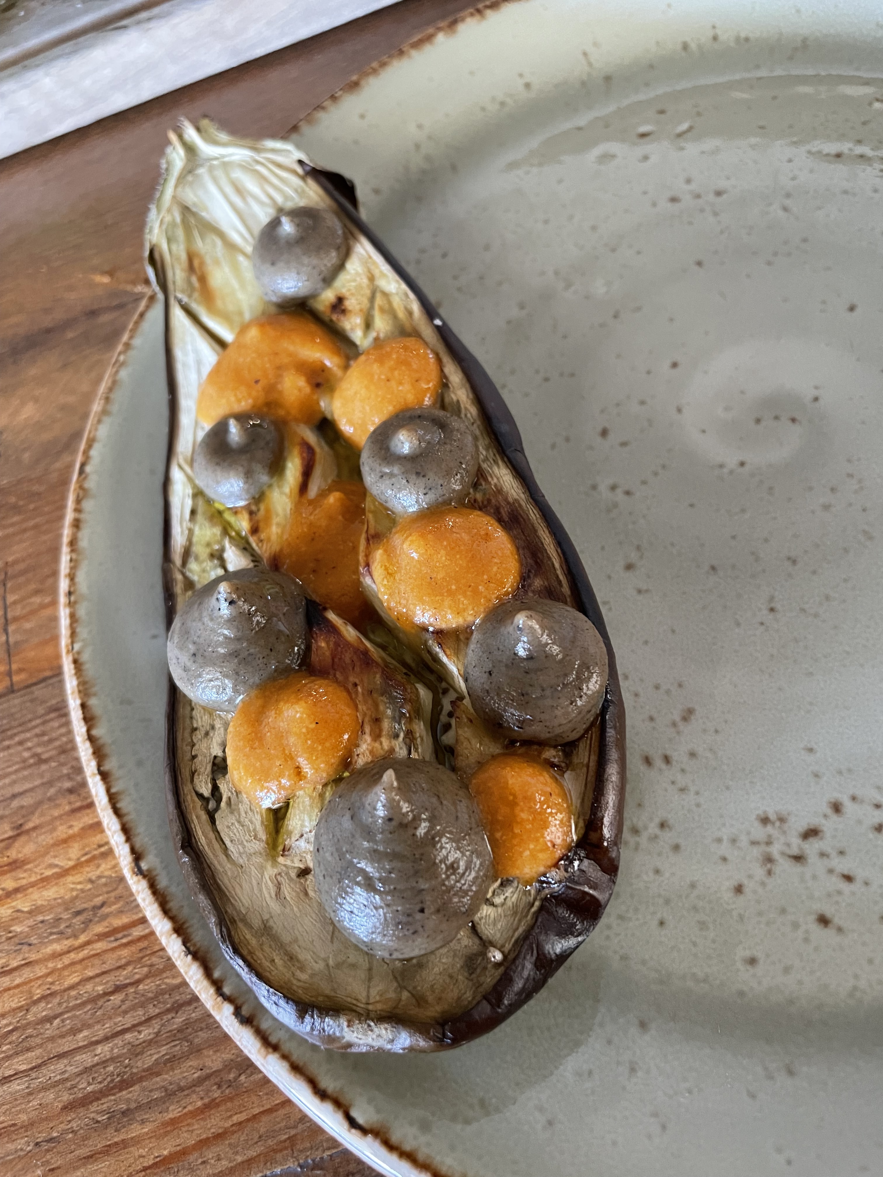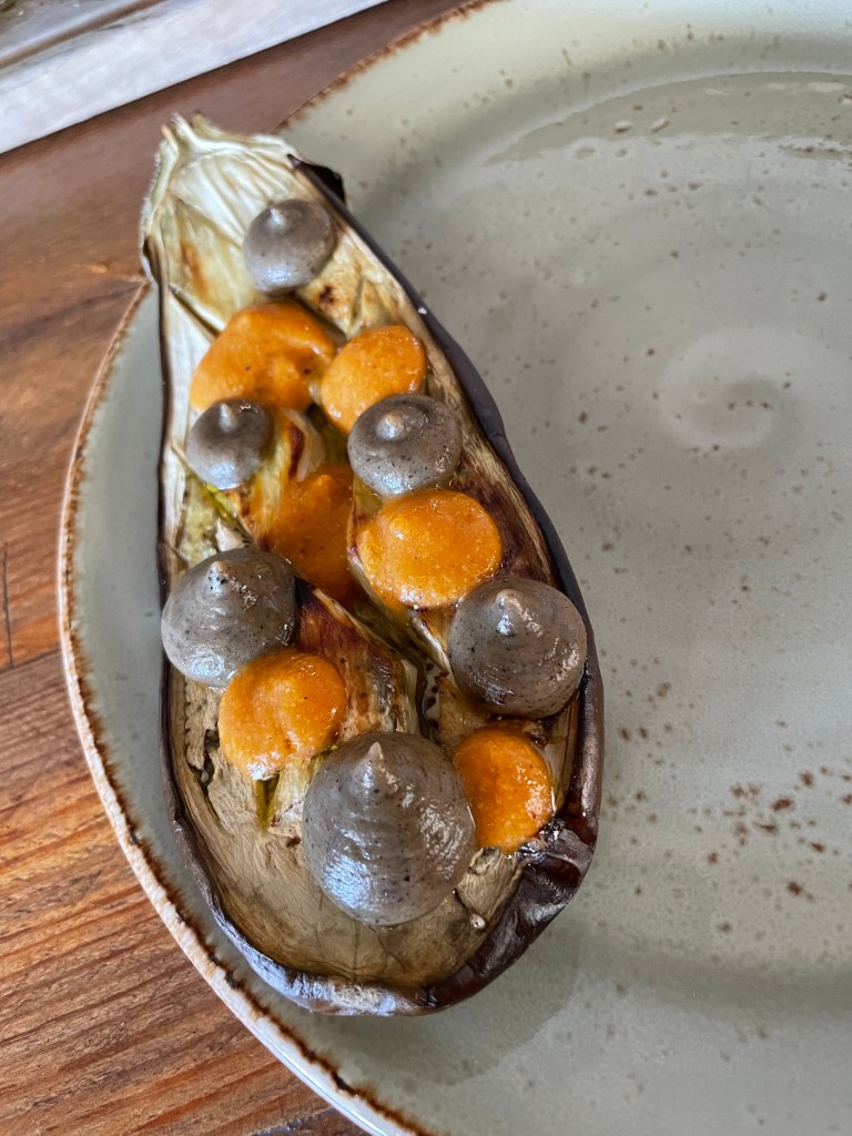 We both had sea bass (21,50€ each), which arrived whole on a wooden platter with a lettuce garnish, baked aubergine, and very good home-cut fries. The fish was perfectly cooked, and my only tiny service gripe was having to suggest that a spare plate would be useful for discarding the inedible parts of the fish.