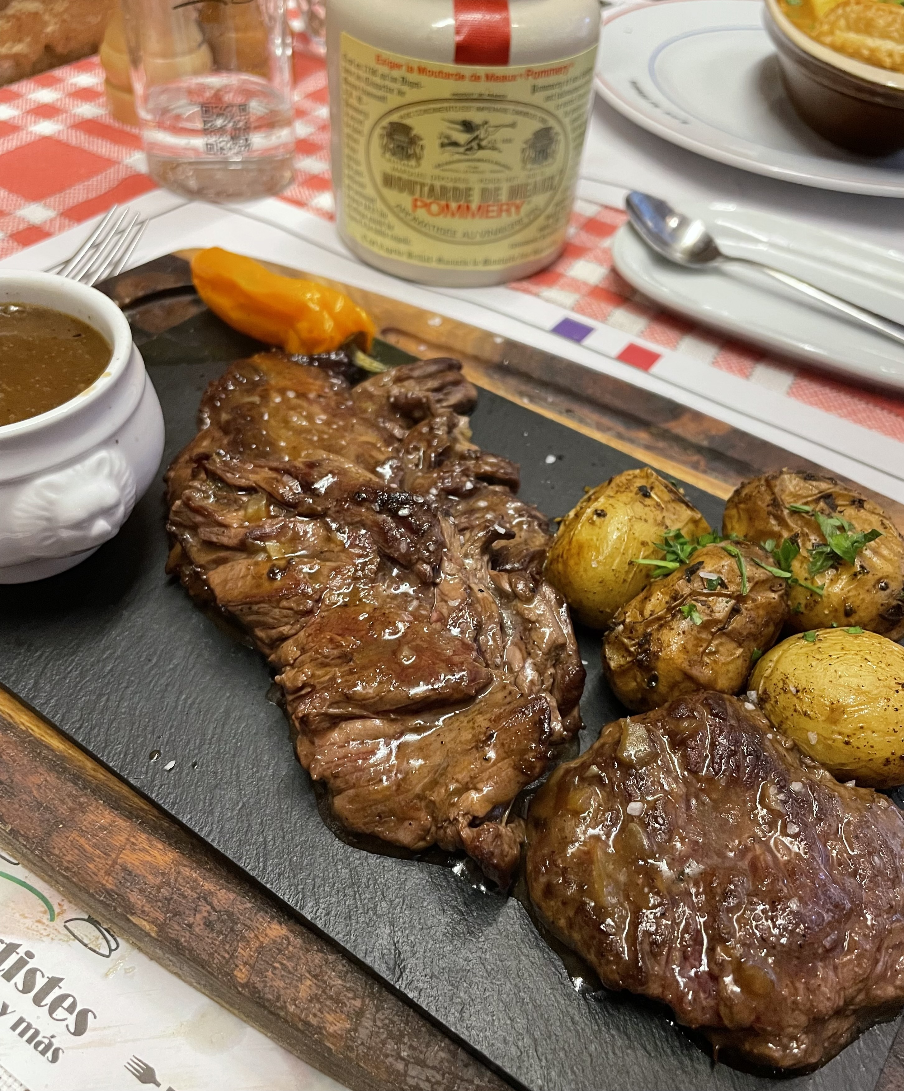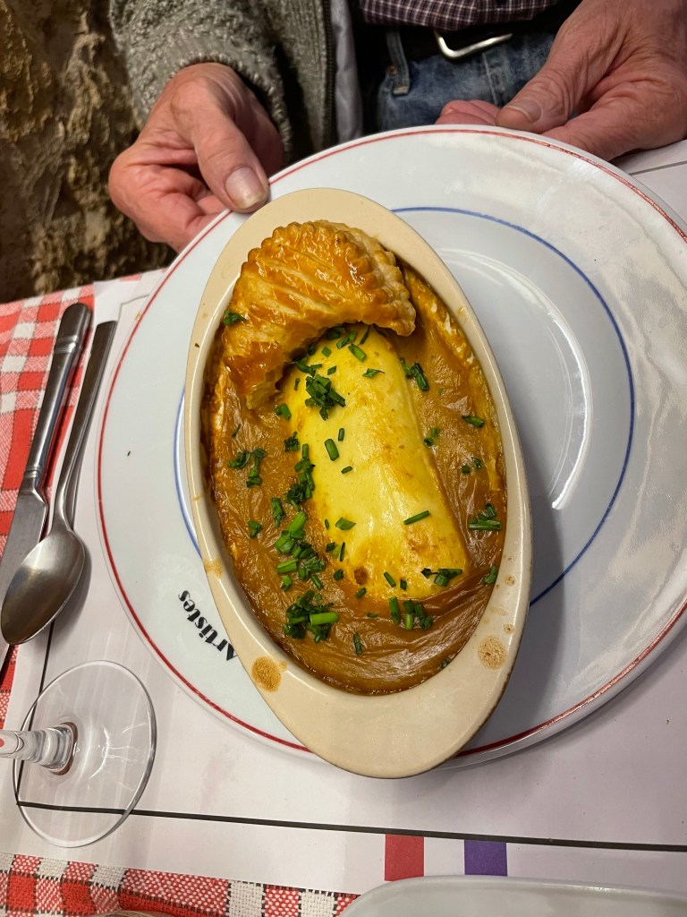 The Boss’s main course was pike ‘quenelle de brochet avec sauce Nantua’ – a typical dish from Lyon and the perfect winter warmer with its rich sauce and puff pastry garnish (17,30€). A friend had recommended the beef dish, ‘onglet de boeuf, sauce aux échalots’ and although I eat little red meat, I chose this dish with its oven-baked new potatoes and shallot sauce (18,70€). Our waitress asked me how I’d like the hanger steak cooked and the tender meat arrived just as requested. It was delicious.
