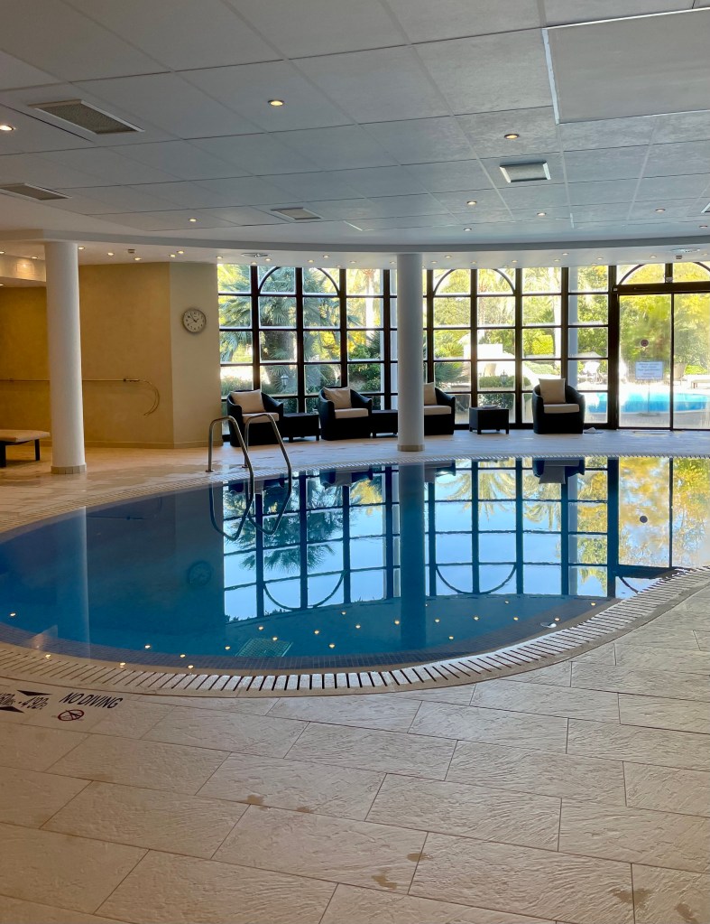 This spacious, modern, and natural light-filled spa has a large, heated indoor pool, whirlpool, steam room, sauna, showers (including overhead ice tub), and plenty of loungers and chairs in the pool area. Spa users have the use of a locker, in which a bathrobe, slippers, and a towel are provided. There’s no shortage of fresh towels around the pool area should you need more.