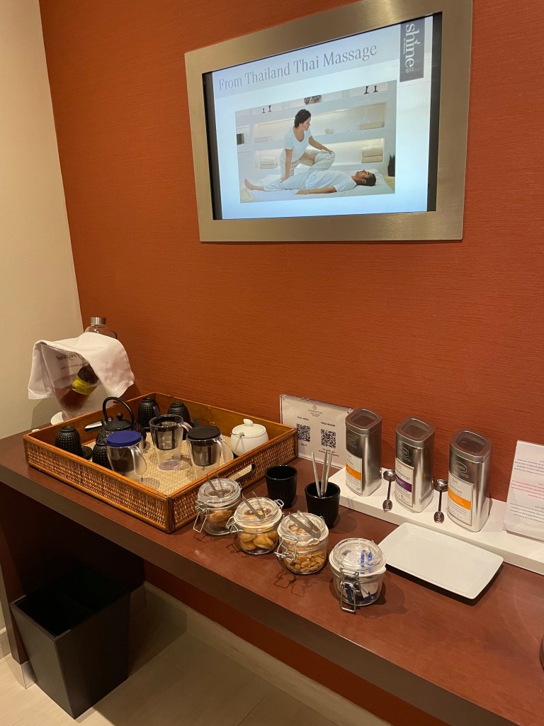 A water dispenser with reusable glasses will help you keep hydrated but if you want other drinks, these can be arranged by the spa reception team. Incidentally, I found the whole spa team to be helpful and friendly.