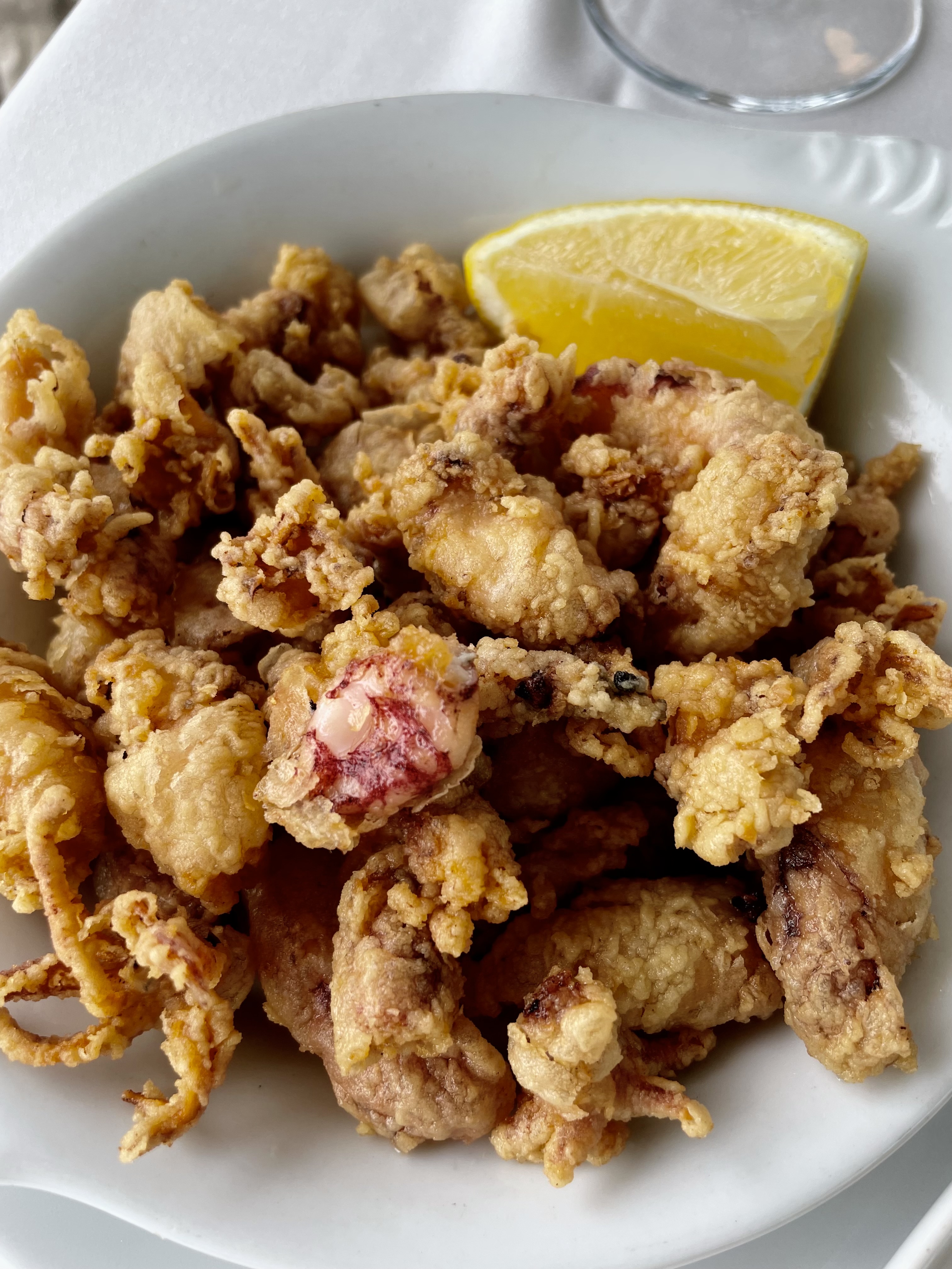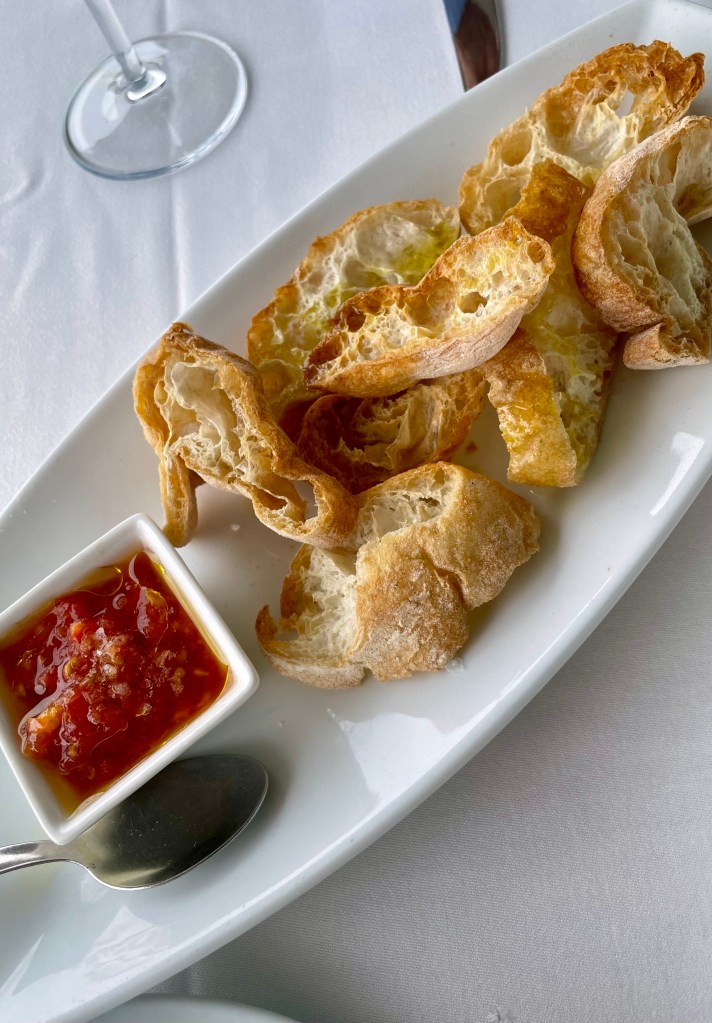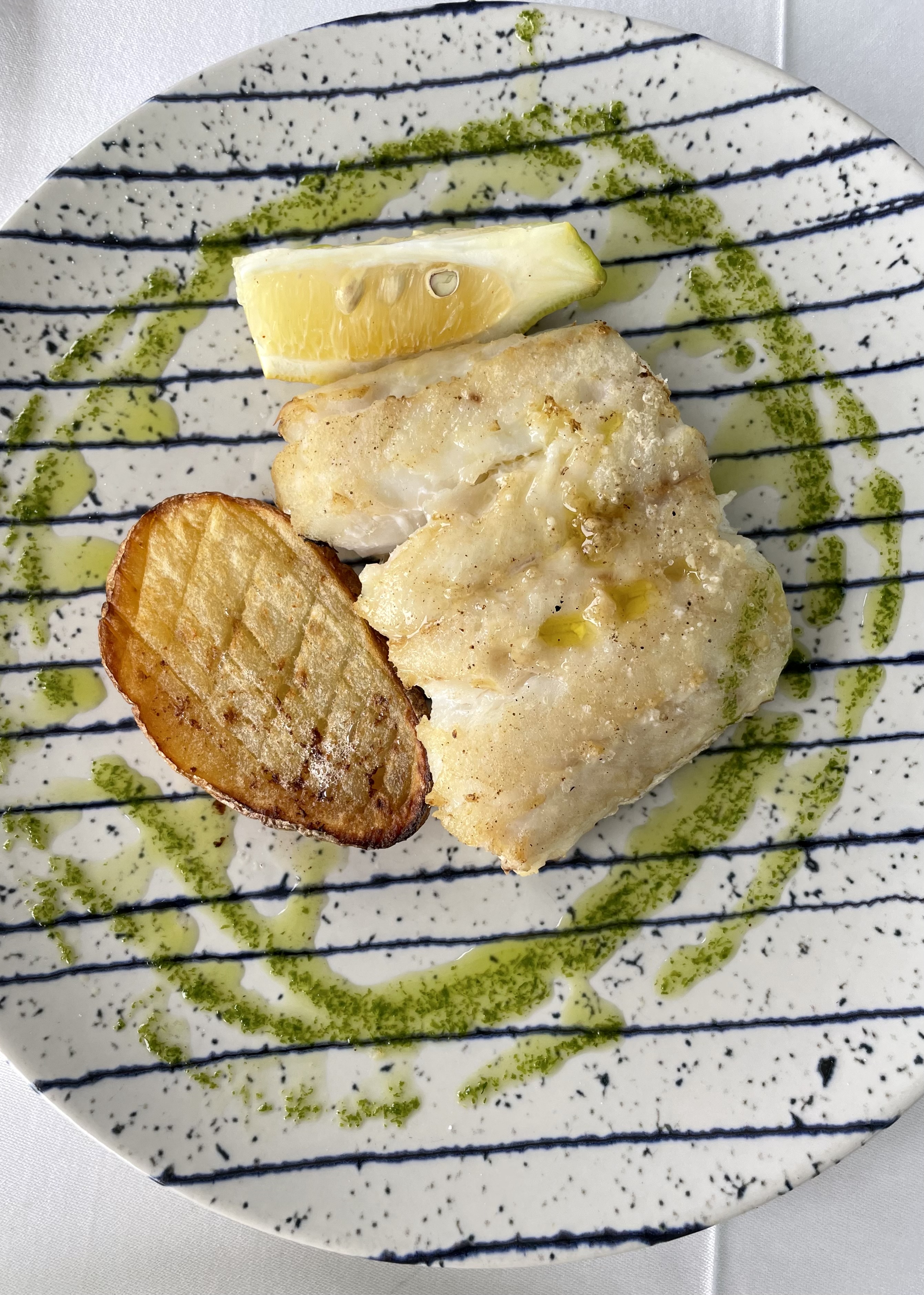 To begin our lunch, we shared crispy shrimps (a portion of six) with a honey and mustard sauce, fried calamari, and crystal bread. Our main course dishes were sea bass and supreme of hake – both of which came with half a baked potato and a side salad.