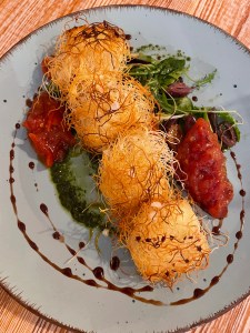 I had crunchy mozzarella wrapped in angel hair pasta with tomato jam – definitely enough for two people (or even three); The Boss opted for a generous plateful of carpaccio of bresaola with rocket and Parmesan.