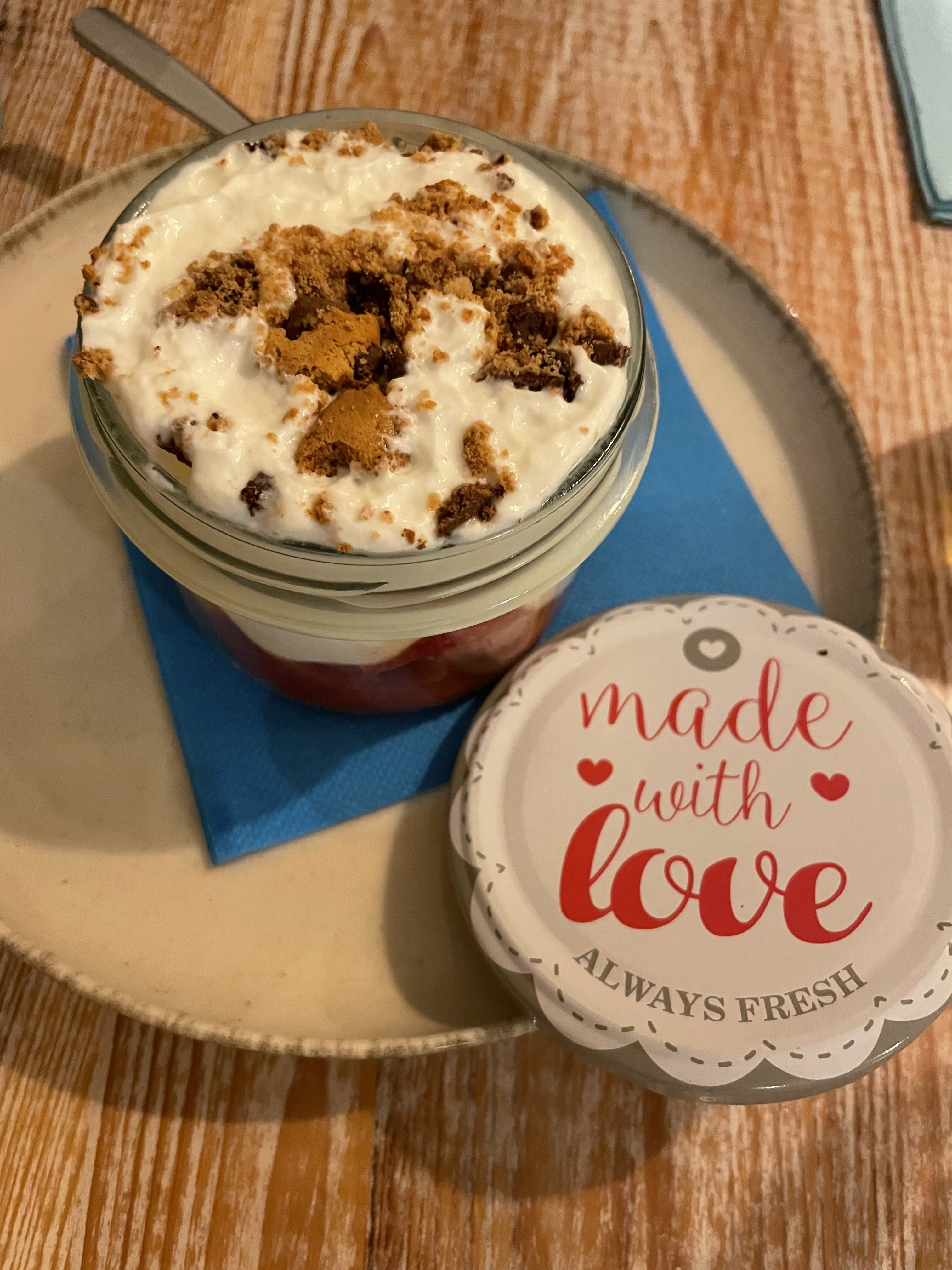 Of the two home-made desserts (5,50€ each), we chose a light yogurt mousse with strawberries. A fresh-tasting conclusion to an enjoyable dinner.