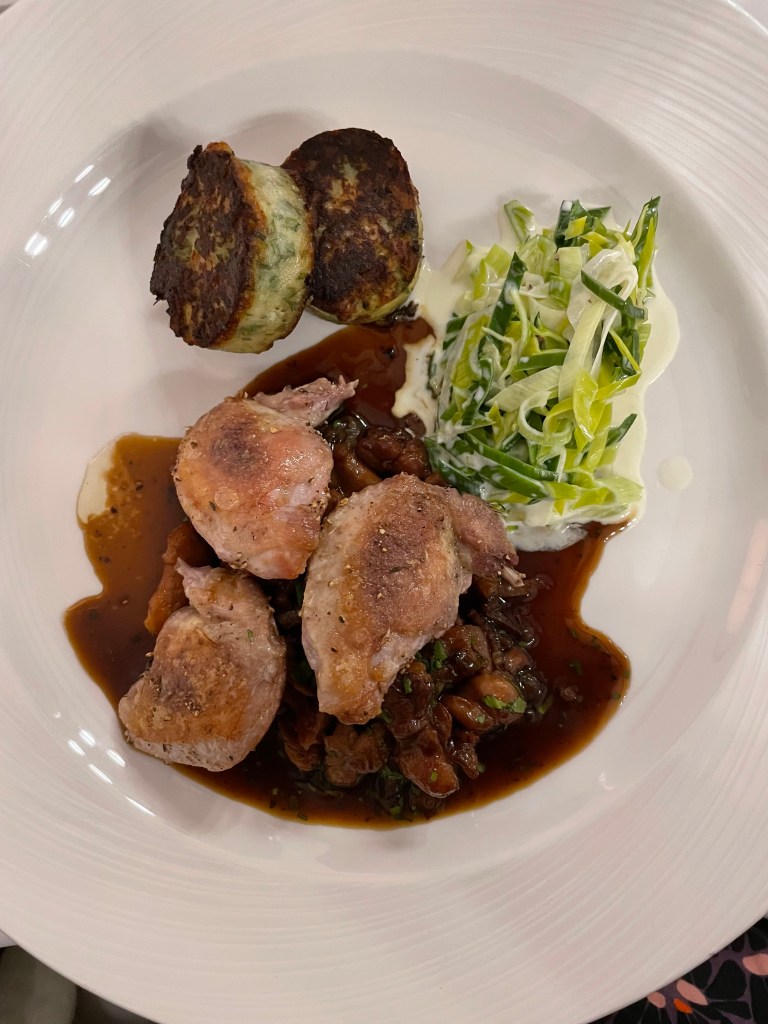 Our main course dishes were fillet of sea bass with black risotto and a lobster sauce (24,50), and coq au vin made with quail rather than the traditional rooster or chicken. (24,50€). Both were expertly cooked and attractively presented.