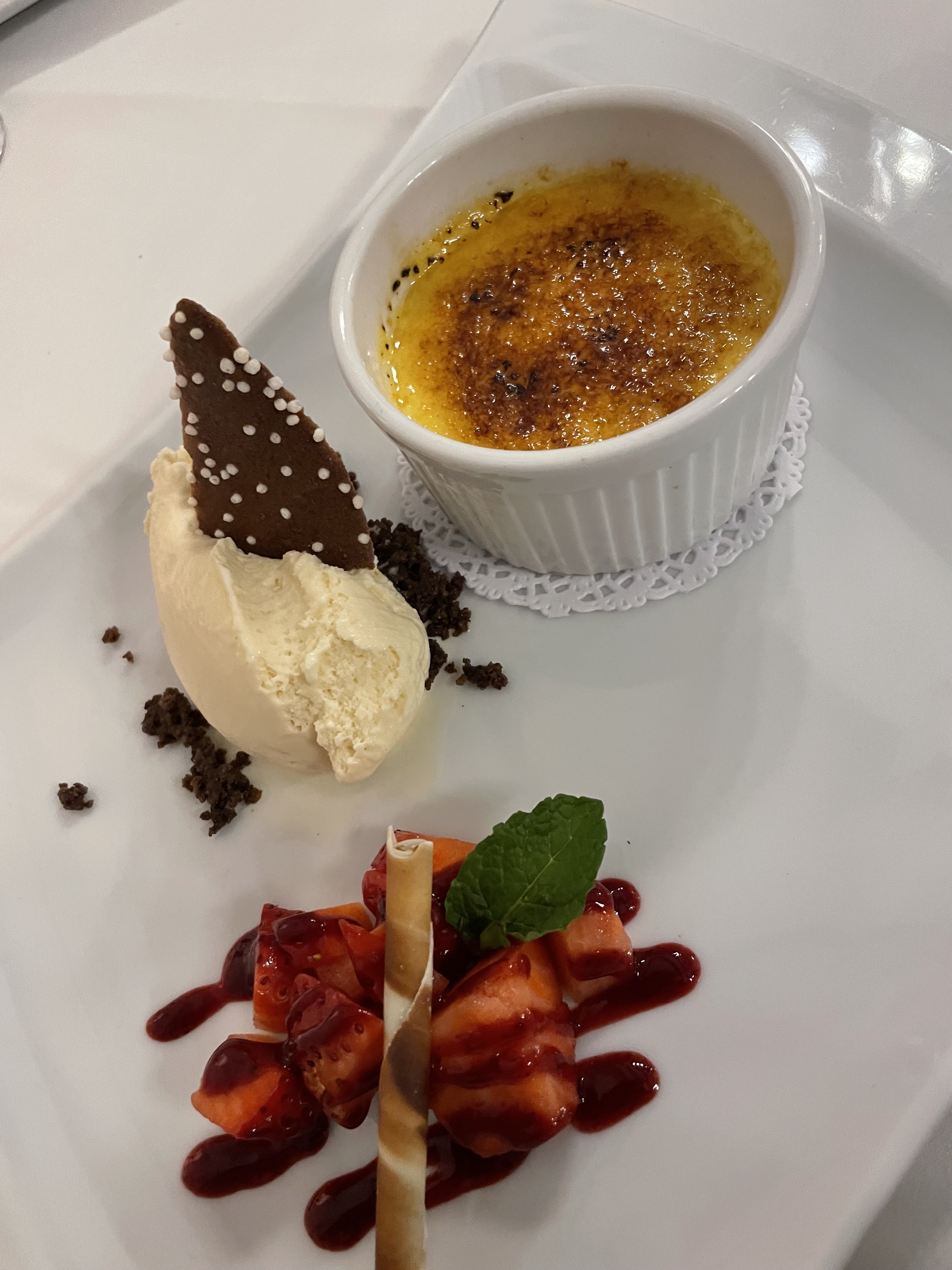 Desserts were a semifreddo of chocolate and caramel with an orange salad to counter the richness (11,50€) and crème brûlée of passion fruit with tonka bean ice cream and strawberries (11,50€). I’d recommend either of these.