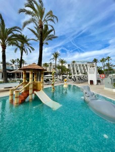 The main swimming pool is enormous, with plenty of loungers and parasols around it. A separate, smaller one is available in a quieter location for adults only. Both have a pool bar. The hotel spa (which we didn’t use) also has an indoor pool. The children’s pool made me wish I was five again.
