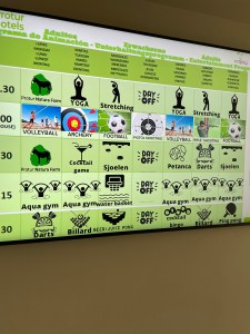 Evenings also offer entertainment. On the night we were there, two female gymnasts were performing on the small stage in the spacious bar. Several rows of mesmerised children sat cross-legged on the floor watching. Musical acts can also be expected. For many holidaymakers, an entertainment programme is essential. We preferred to sit on our balcony enjoying the evening air and a glass of wine bought from the bar; we’re all different.