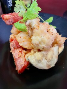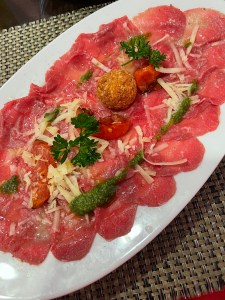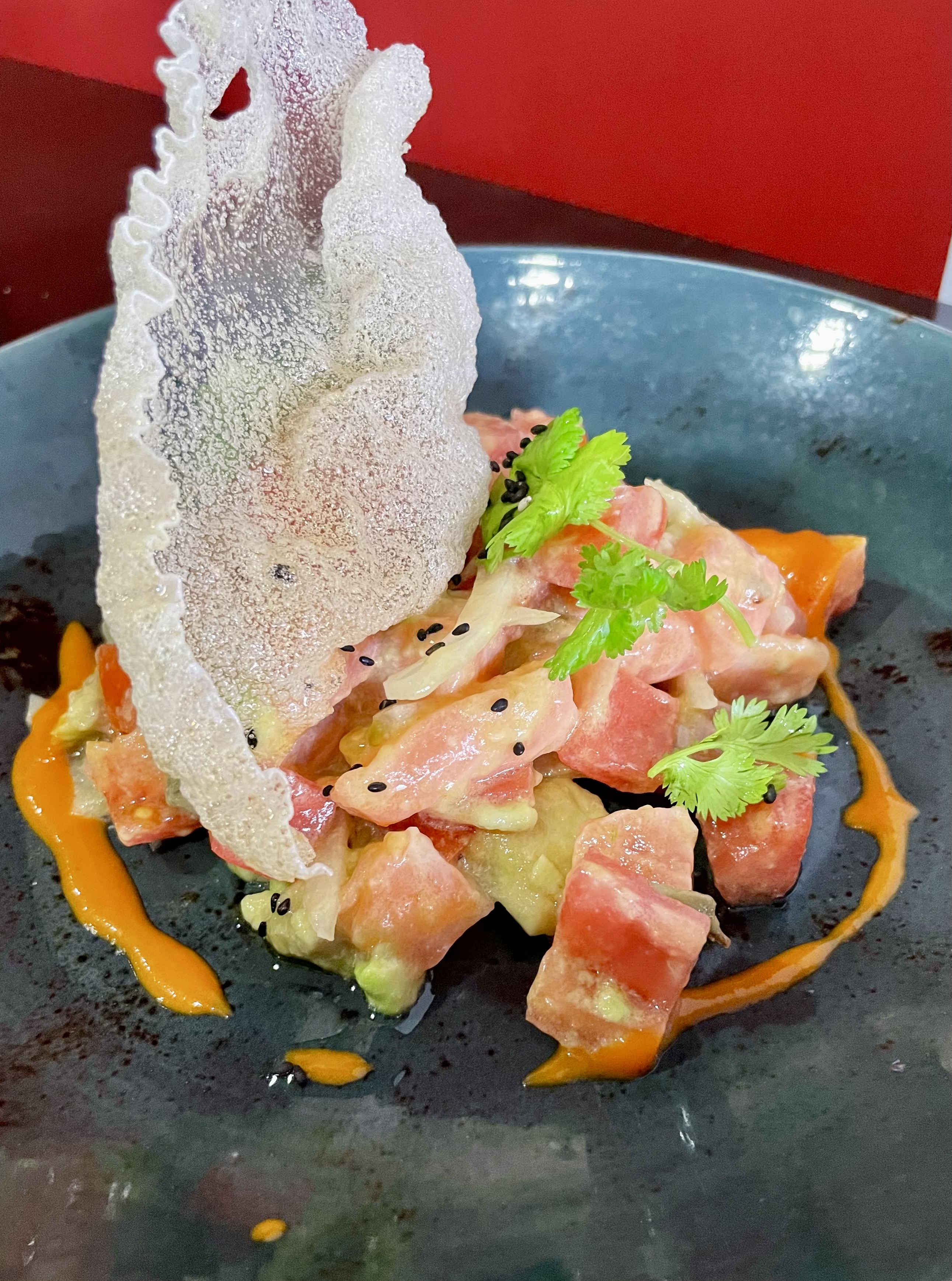 For our last visit, we opted for prawn and vegetable tempura (6,50€), which was described as a tapa but was generous in size and shareable. The tempura was light and there was a variety of vegetables as well as three prawns. I’d have it again. We also tried a couple of the suggested main-course dishes: a generous plate of beef carpaccio with dried tomato and rocket pesto (12€) and a bowl of salmon ceviche with avocado and coriander (12€). Both were excellent.