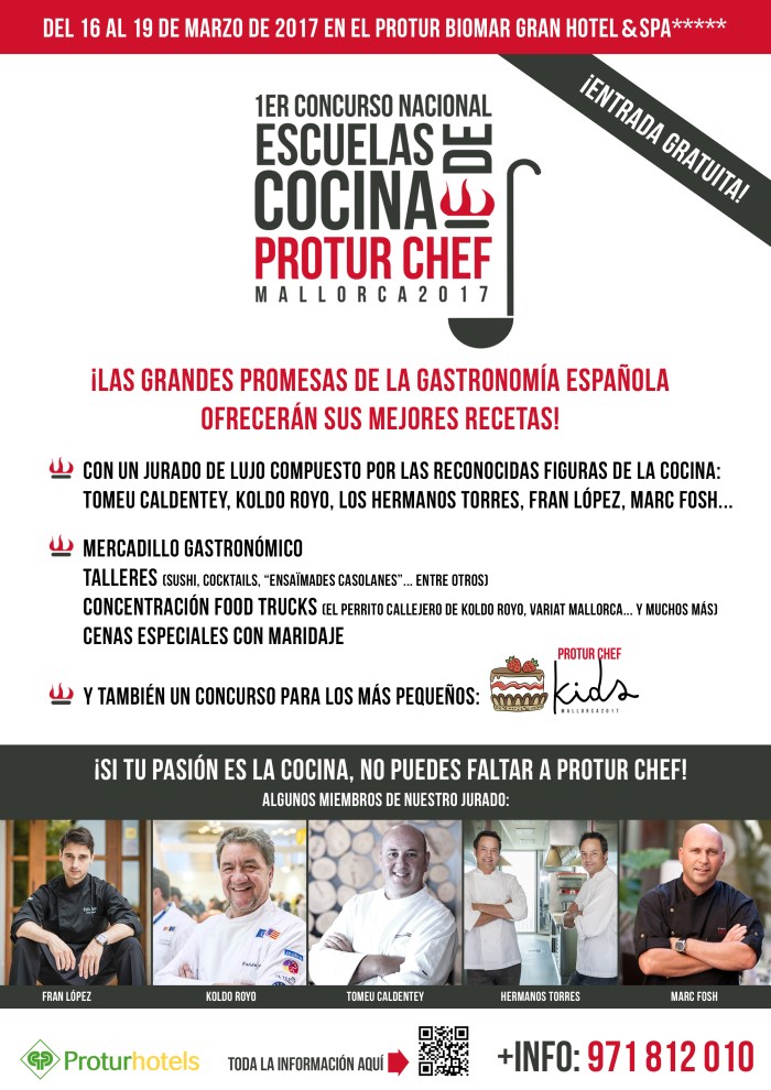Fast forward to March 16th-19th, 2017: 20 young chefs from cookery schools all over Spain will be similarly impressed to have a panel of well-known professionals judging their work at Protur Chef. This event is the first national culinary schools competition and takes place at the 5-star Protur Biomar Gran Hotel & Spa in Sa Coma, on Mallorca’s east coast.