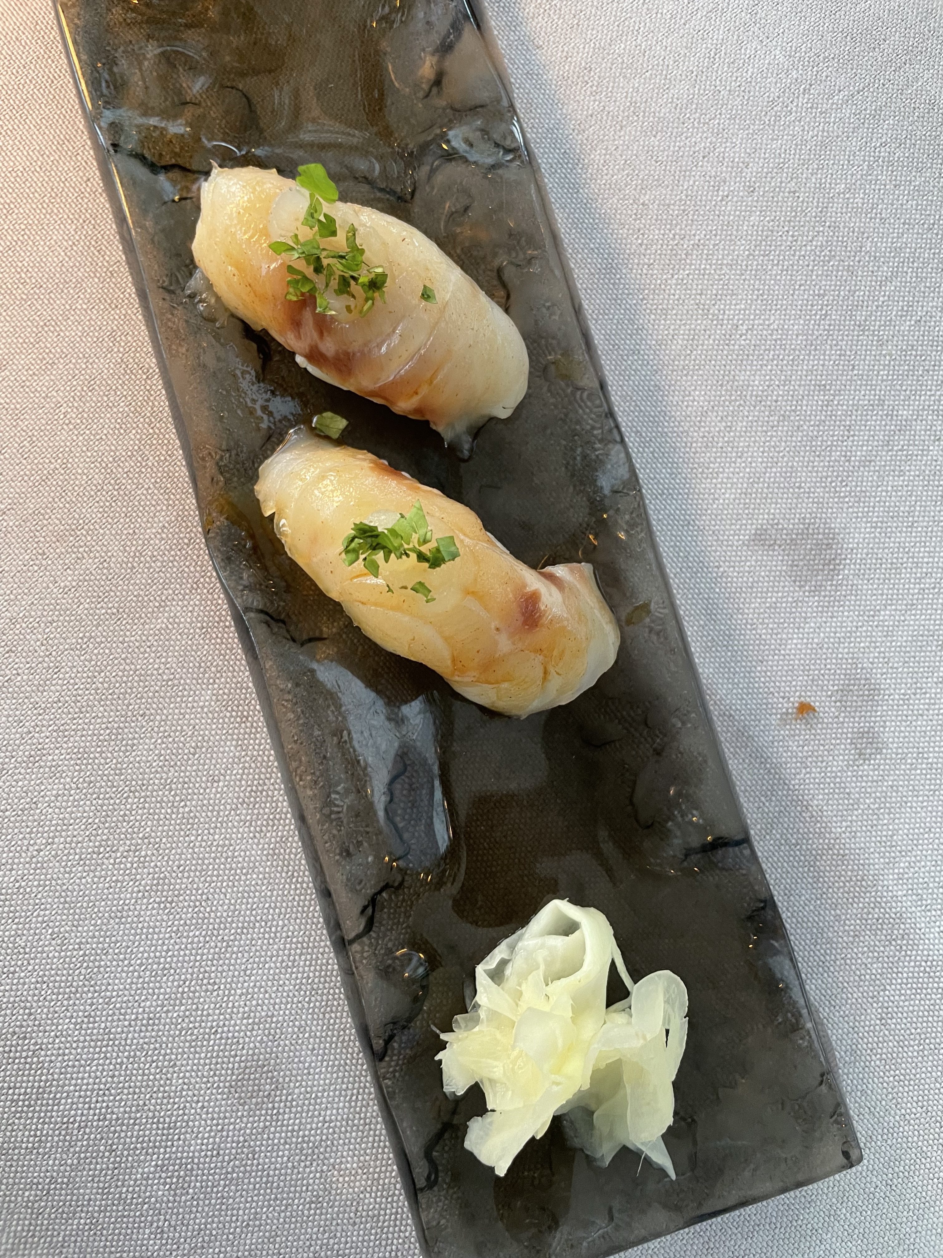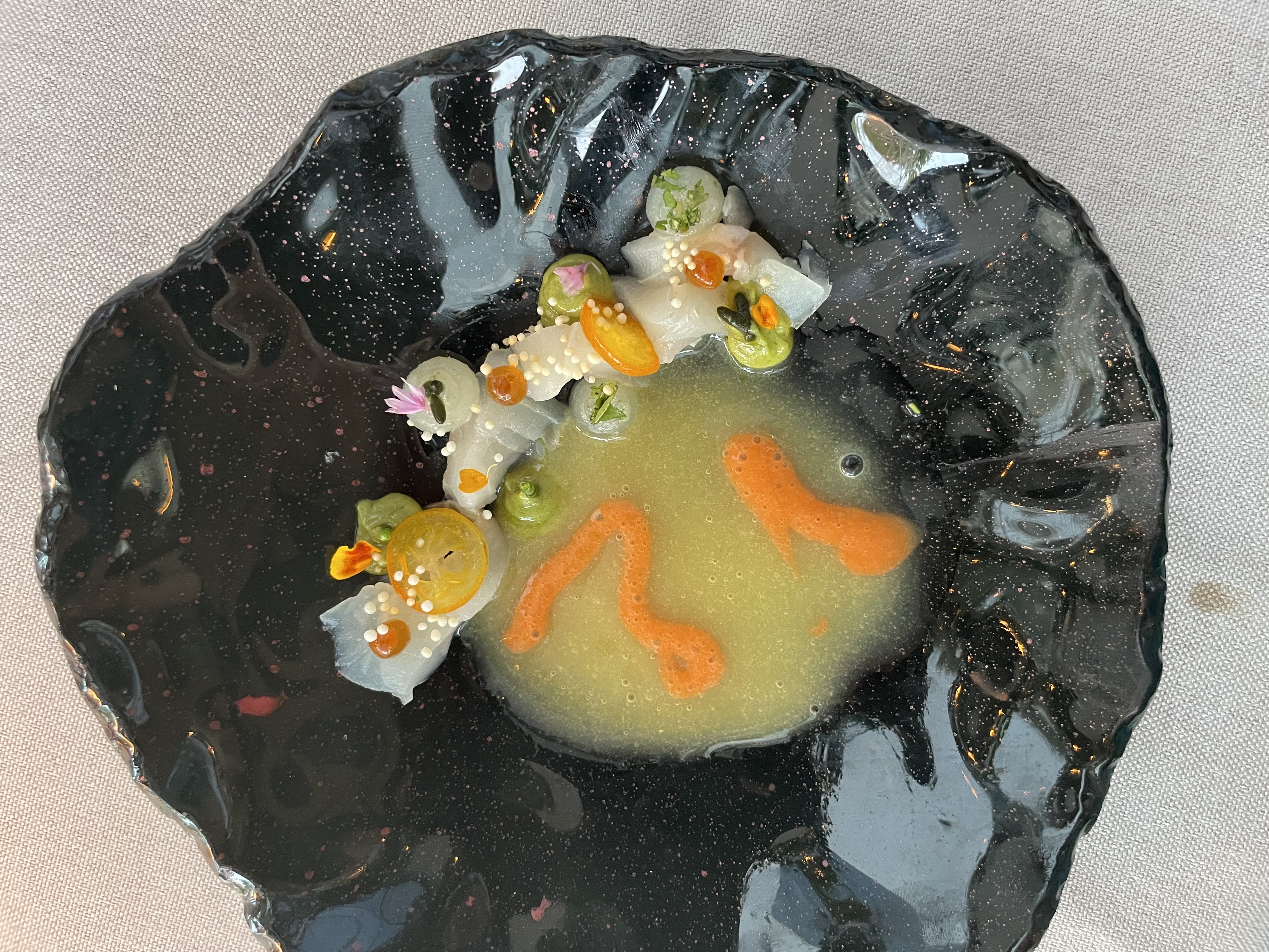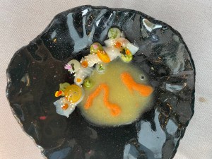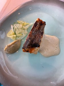 We visited earlier this year before the weather was warm enough to eat outside. A basket of three types of bread arrived with green olives and a fresh cheese spread – a pleasant change from aioli. Once we’d ordered, our server brought us a complimentary appetizer of turnip soup.
