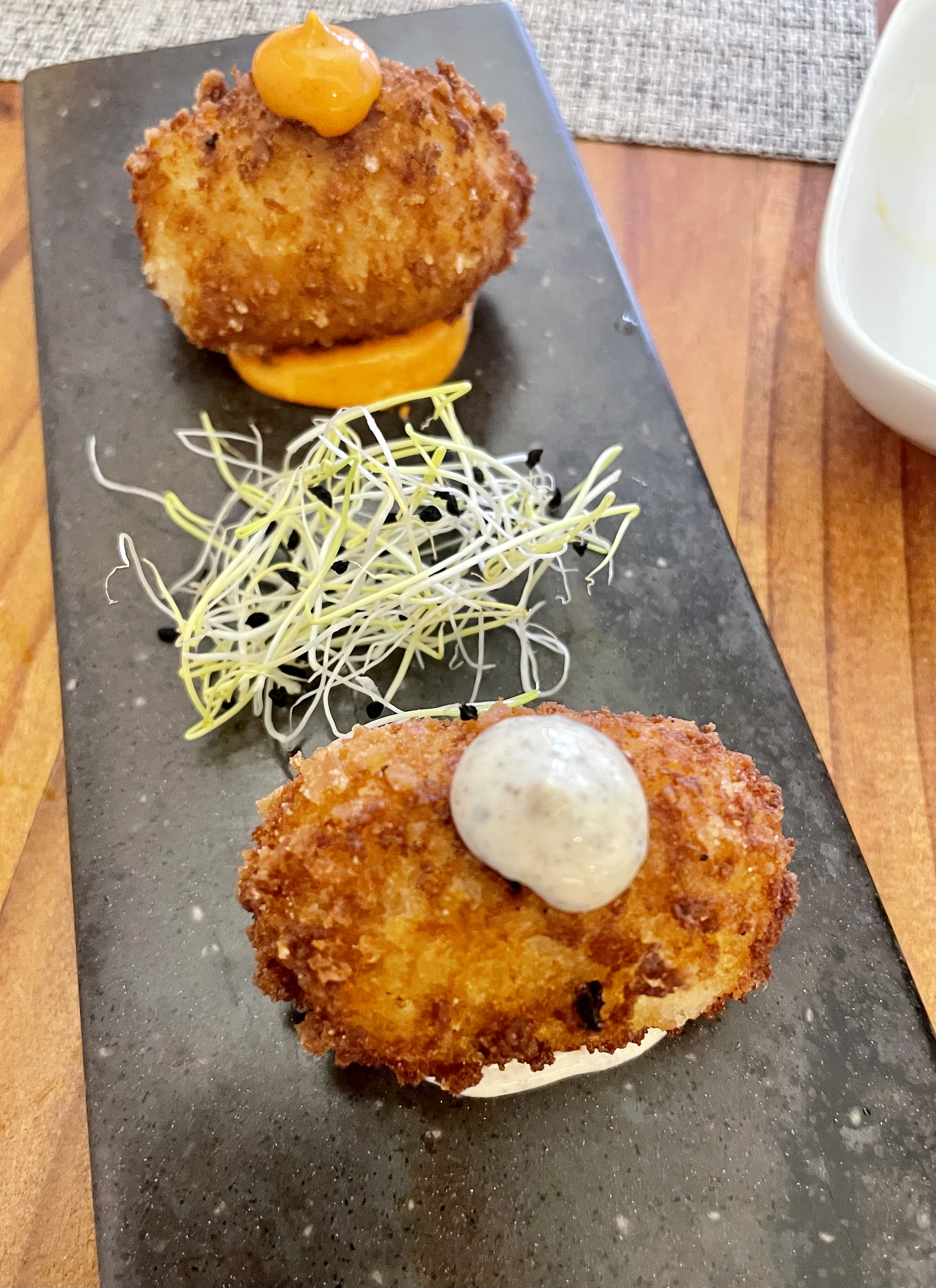 There’s table seating for around 20 diners and a few seats at the counter – behind which most of the cooking and plating is done. The interior is contemporary, clean, and bright, and the ambience is informal, with music playing.