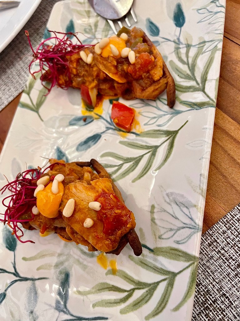 The three-course weekday lunch costs 18€ and offers a choice of four starters, four main courses, and desserts – with vegetarian options available. The daily changing menú del día isn’t printed, so Cati comes to the table to tell you the choices. Xeixa wheat bread, oil, and salt cost an extra 1.90€ per person and you’re asked whether you want it – unlike many restaurants where you’re served it automatically. I’m a bit fussy about bread and don’t really enjoy the sliced, standard, white baguette that is often in a bread basket.